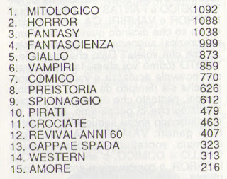 Ovviamente, in quel momento, nessuno prese sul serio il buon posizionamento del genere fantasy o la spiazzante vittoria del genere mitologico... E guardacaso entrambi i generi sono letteralmente ESPLOSI al cinema e in TV nei decenni successivi... Al punto che persino la Bonelli, di recente, ha osato cimentarsi con una serie che ha un'ambientazione fantasy (e dico ambientazione perchè, a mio modesto parere, Dragonero di fantasy ha SOLO l'ambientazione).